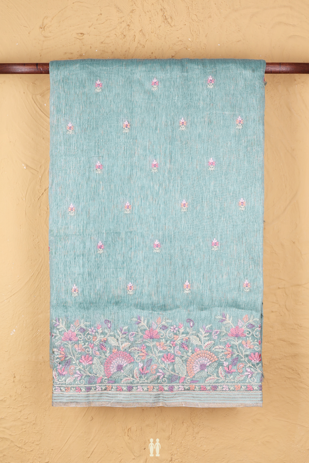 Embrace understated elegance with this linen saree in a serene dusty blue hue. Adorned with delicate floral buttas scattered throughout, it strikes the perfect balance between traditional charm and contemporary refinement. The breathable linen fabric ensures comfort for all-day wear, making it ideal for both casual gatherings and semi-formal occasions.