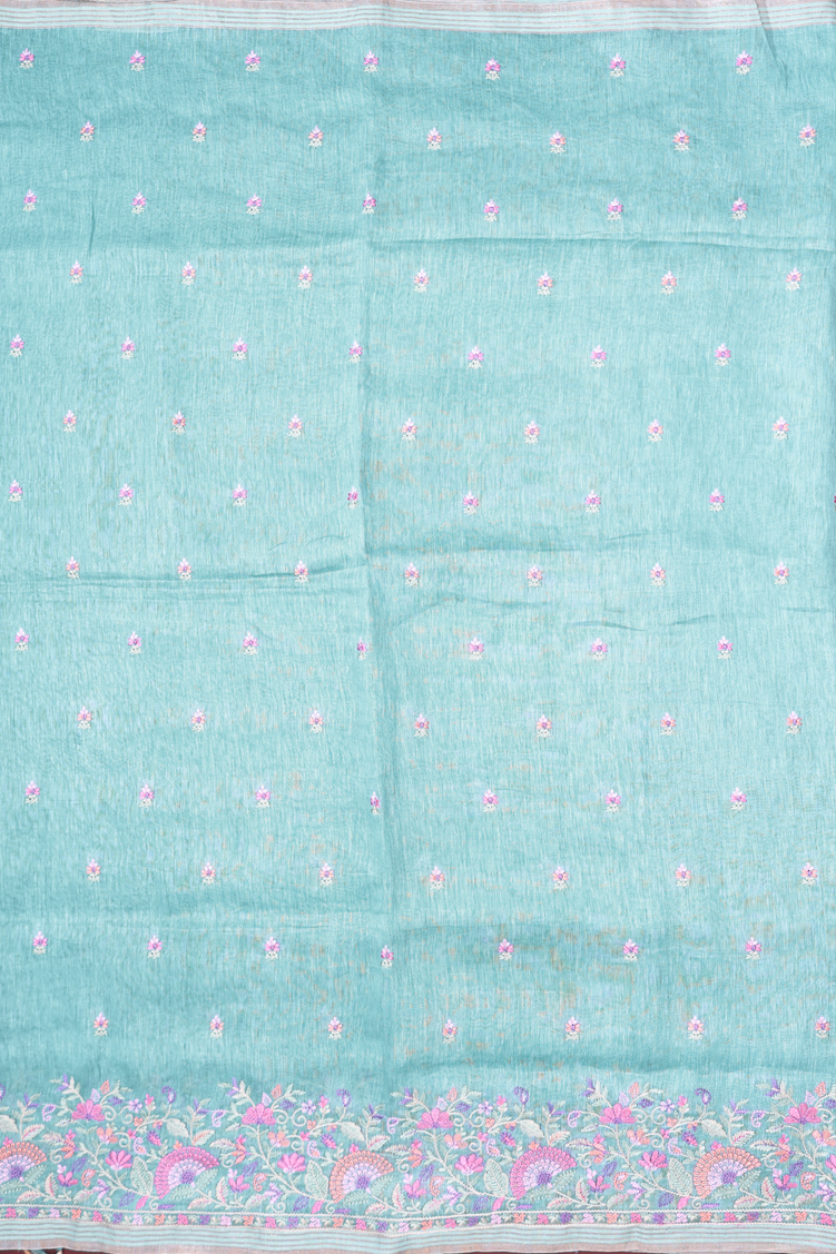 Linen Saree In Dusty Blue With Floral Buttas