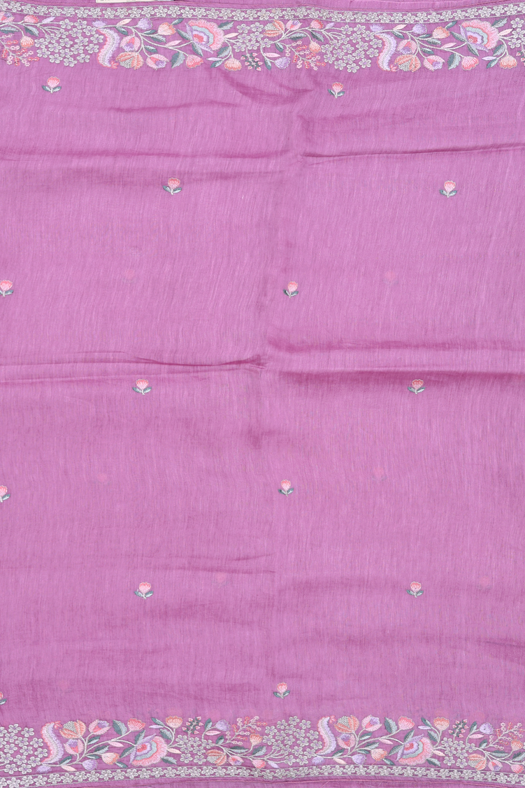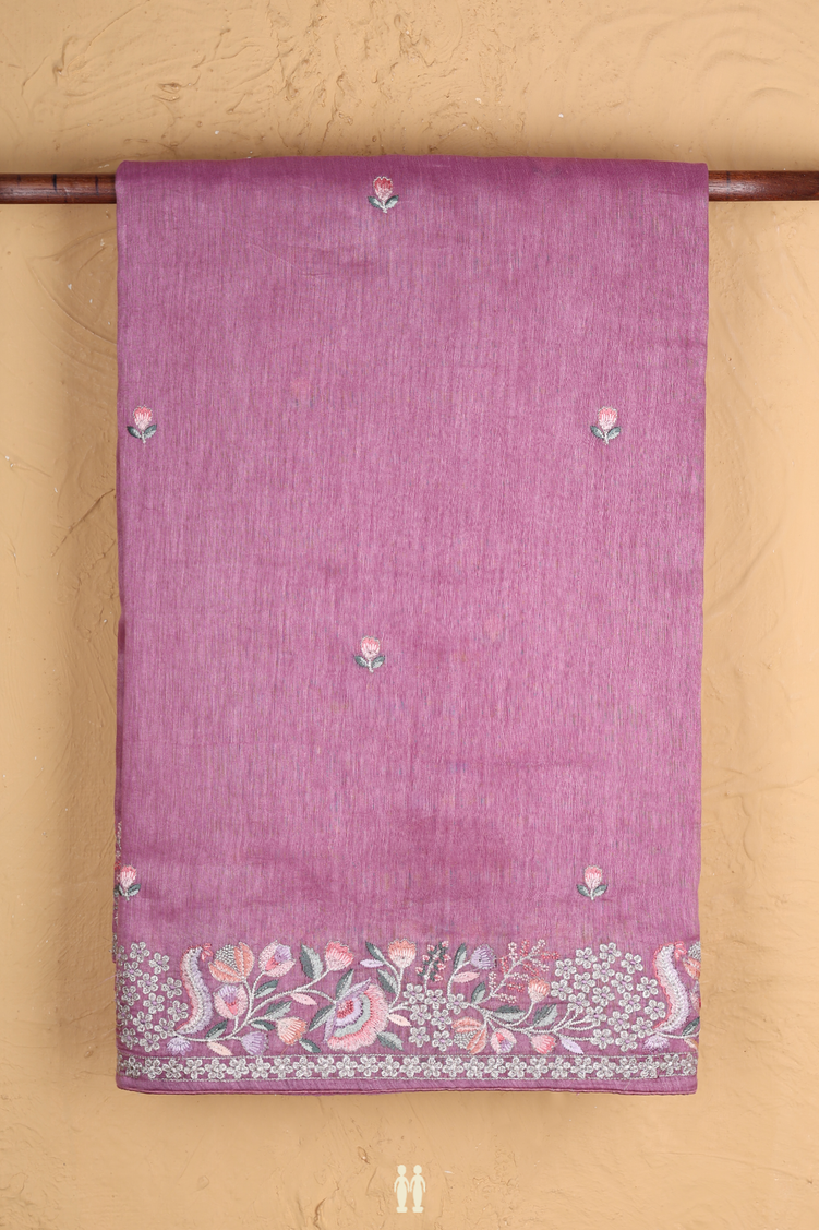 Linen Saree In Dusty Purple Floral Threadwork Buttas