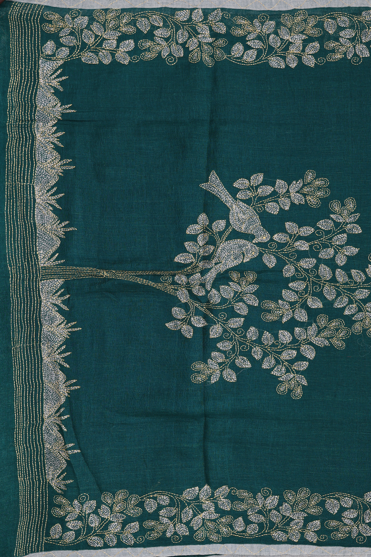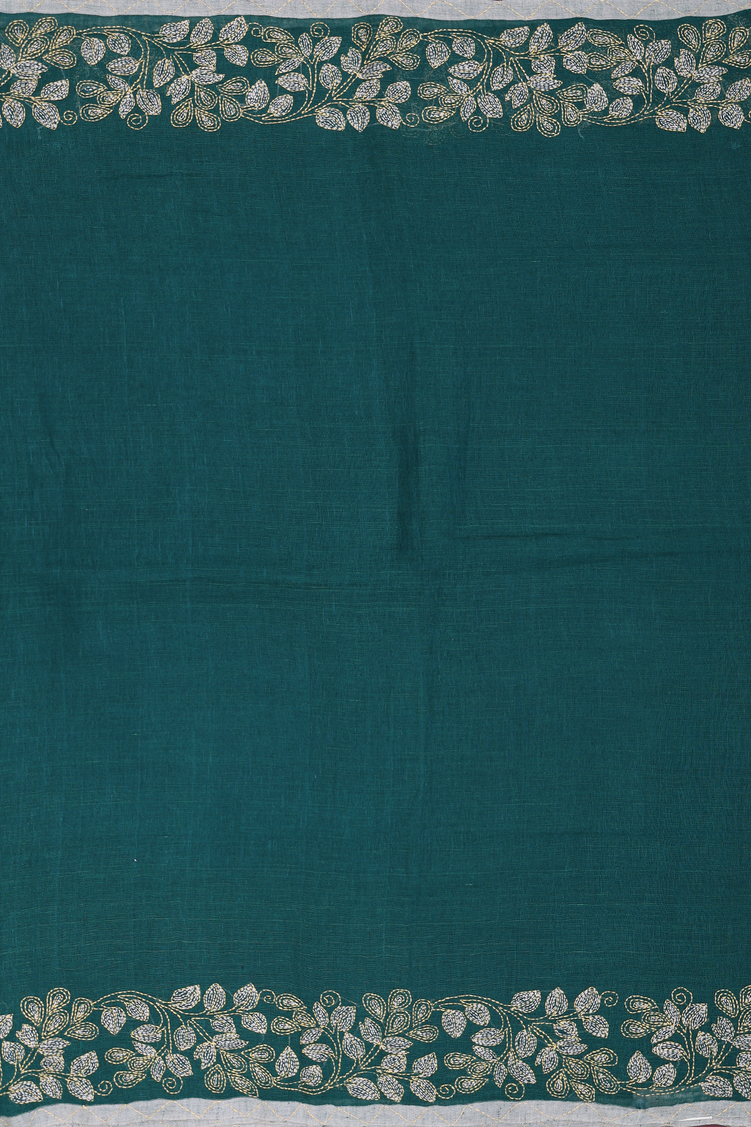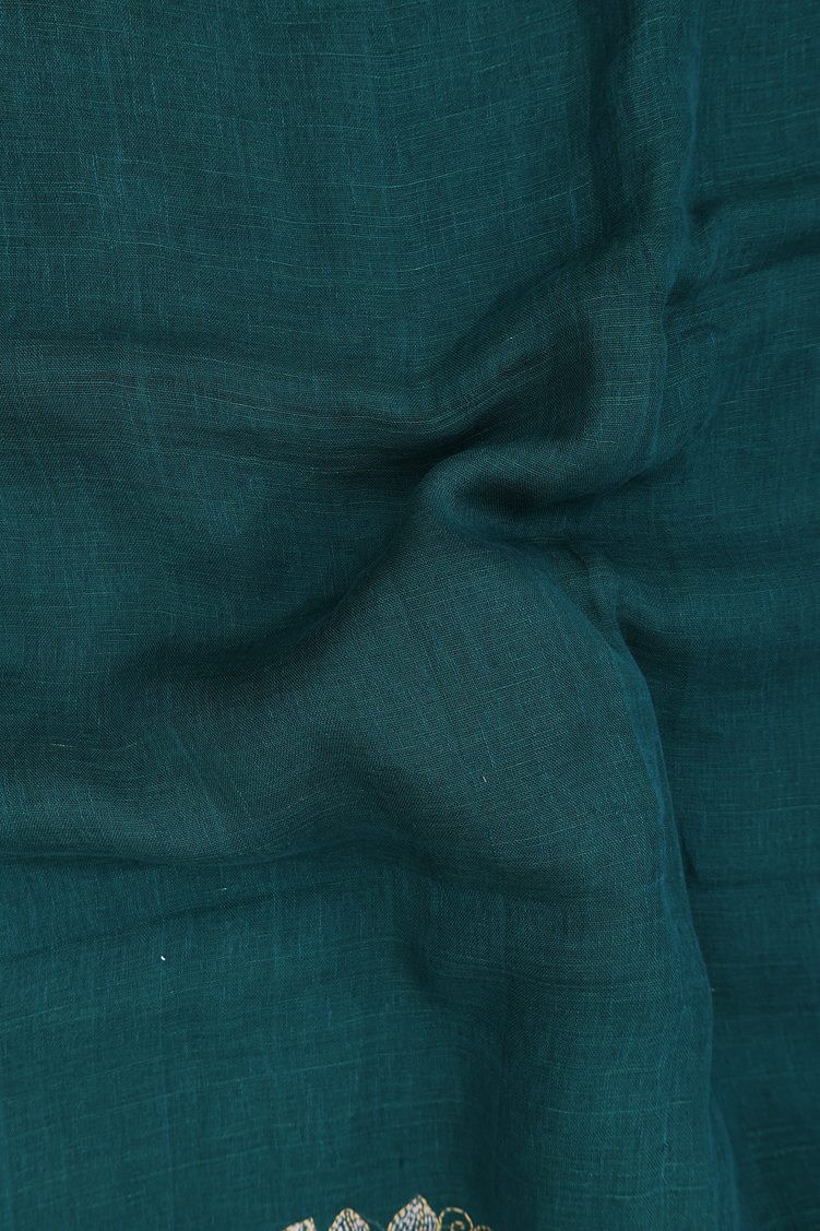 Embrace timeless elegance with this forest green linen saree, a masterpiece of refined simplicity. The breathable linen fabric drapes gracefully, offering comfort without compromising on style. Adorned with an intricate threadwork border that adds subtle sophistication, this saree transitions seamlessly from everyday wear to special occasions. The rich forest green hue complements all skin tones, while the handcrafted detailing showcases traditional artistry. Perfect for those who appreciate understated luxury and sustainable fashion choices.