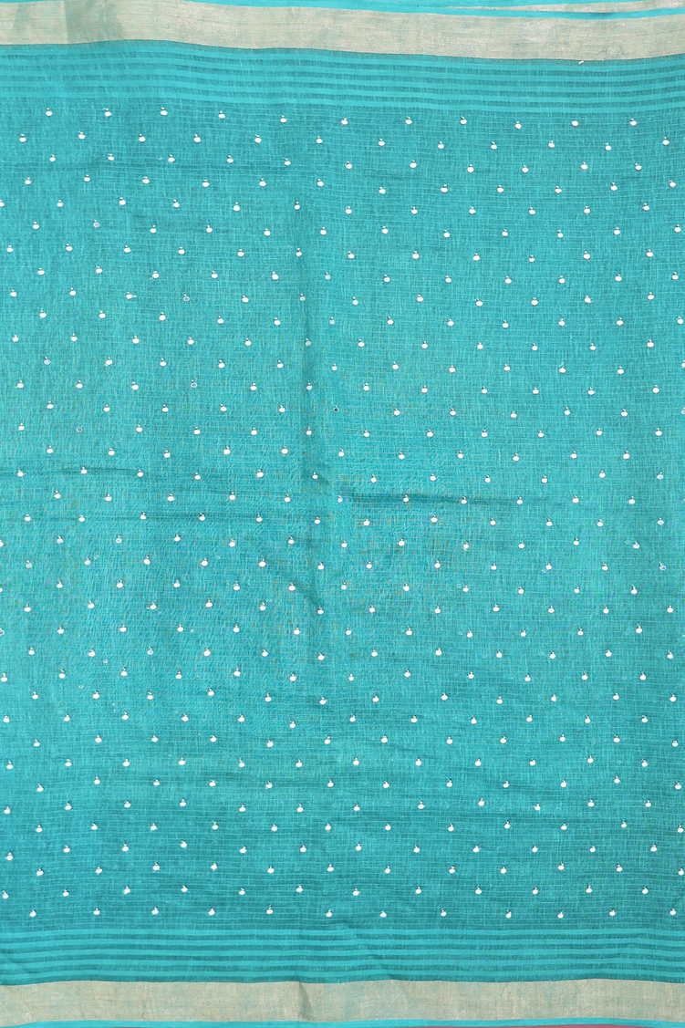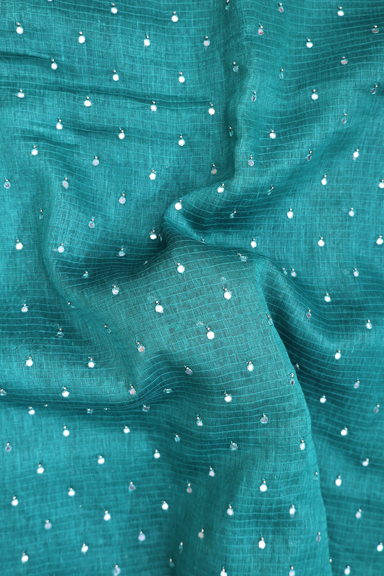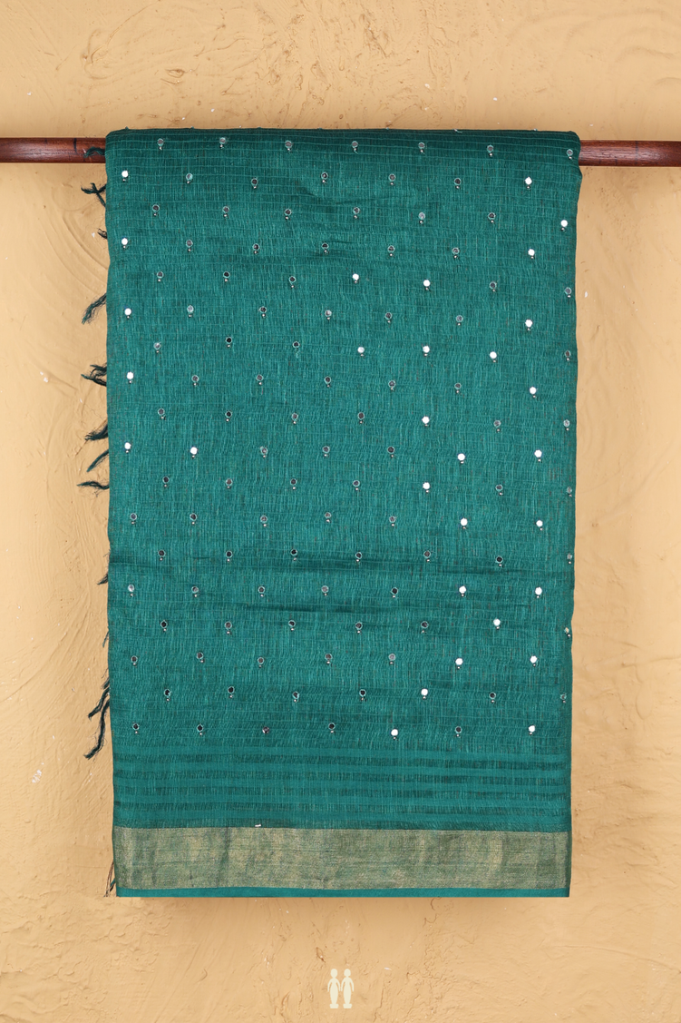 Elevate your ethnic wardrobe with this stunning linen saree in rich green, adorned with intricate mirror work buttis that catch the light beautifully. The breathable linen fabric ensures comfort throughout the day, making it perfect for both festive occasions and casual gatherings. The delicate mirror embellishments add a touch of traditional elegance while maintaining a contemporary appeal.Â