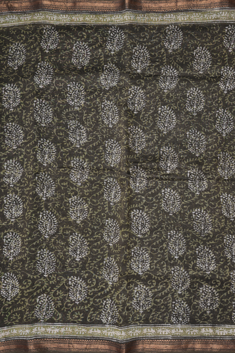 Experience understated elegance with this linen saree in olive green, featuring a delicate paisley printed design. Crafted from breathable linen, it offers comfort alongside refined style, perfect for both casual gatherings and formal occasions. The subtle olive hue complements the intricate paisley motifs, creating a timeless look that enhances your natural grace.