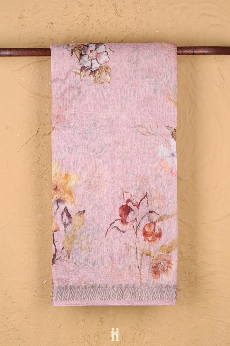 Linen Saree In Pastel Pink With Floral Design