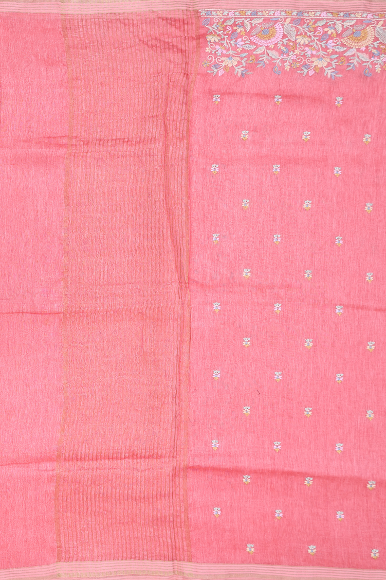 Linen Saree In Peach With Floral Buttas