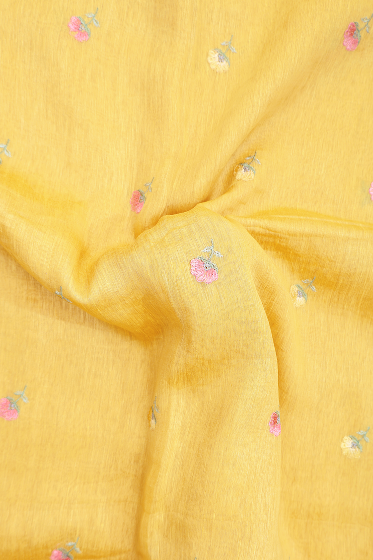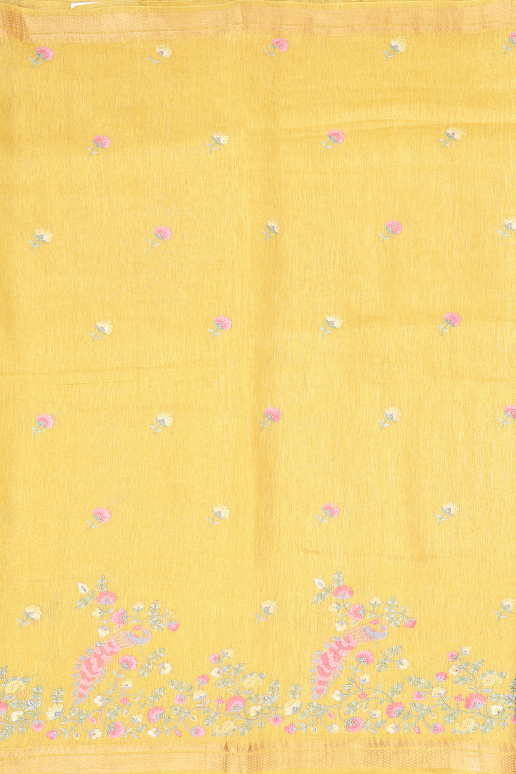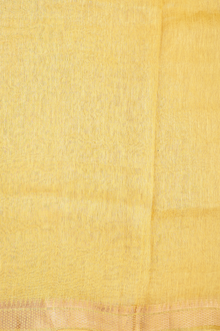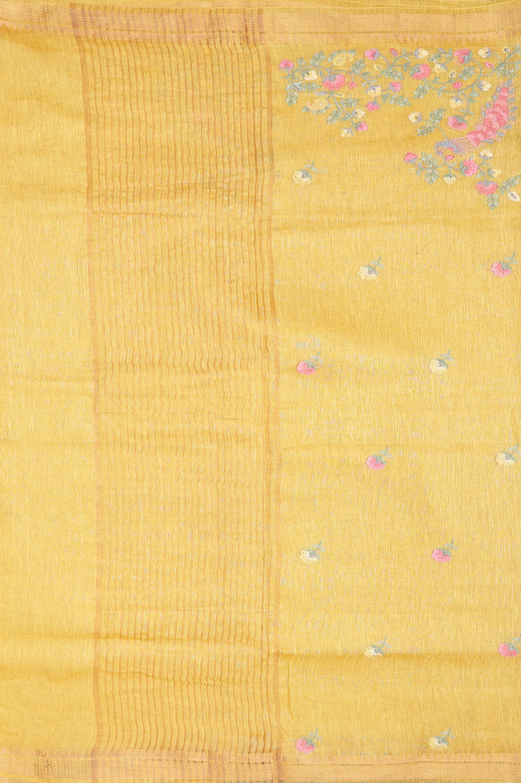 Embrace timeless elegance with this exquisite linen saree, rendered in warm saffron yellow with delicate floral motifs. Crafted from breathable linen fabric, this saree offers comfort without compromising on style, making it ideal for both casual gatherings and festive occasions. The intricate floral design adds a touch of refined sophistication, while the natural texture of linen ensures effortless draping.Â