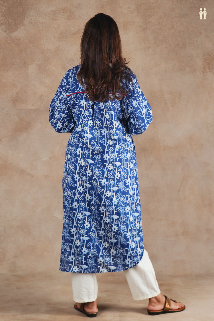 Mandarin Neck Floral Design Blue Cotton Long Kurta