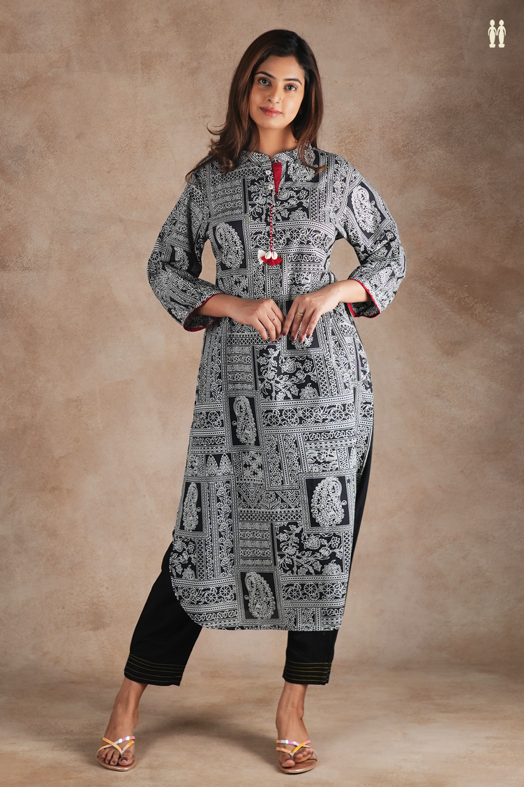 Mandarin Neck Printed Design Black Cotton Long Kurta