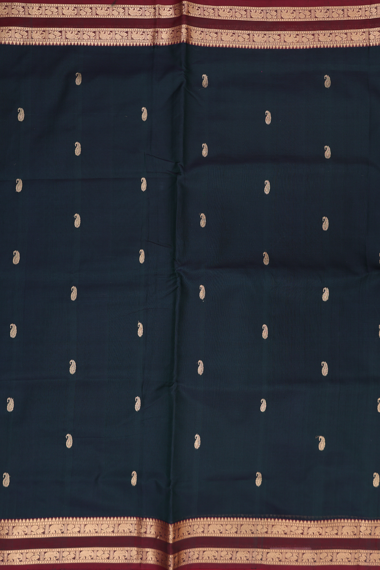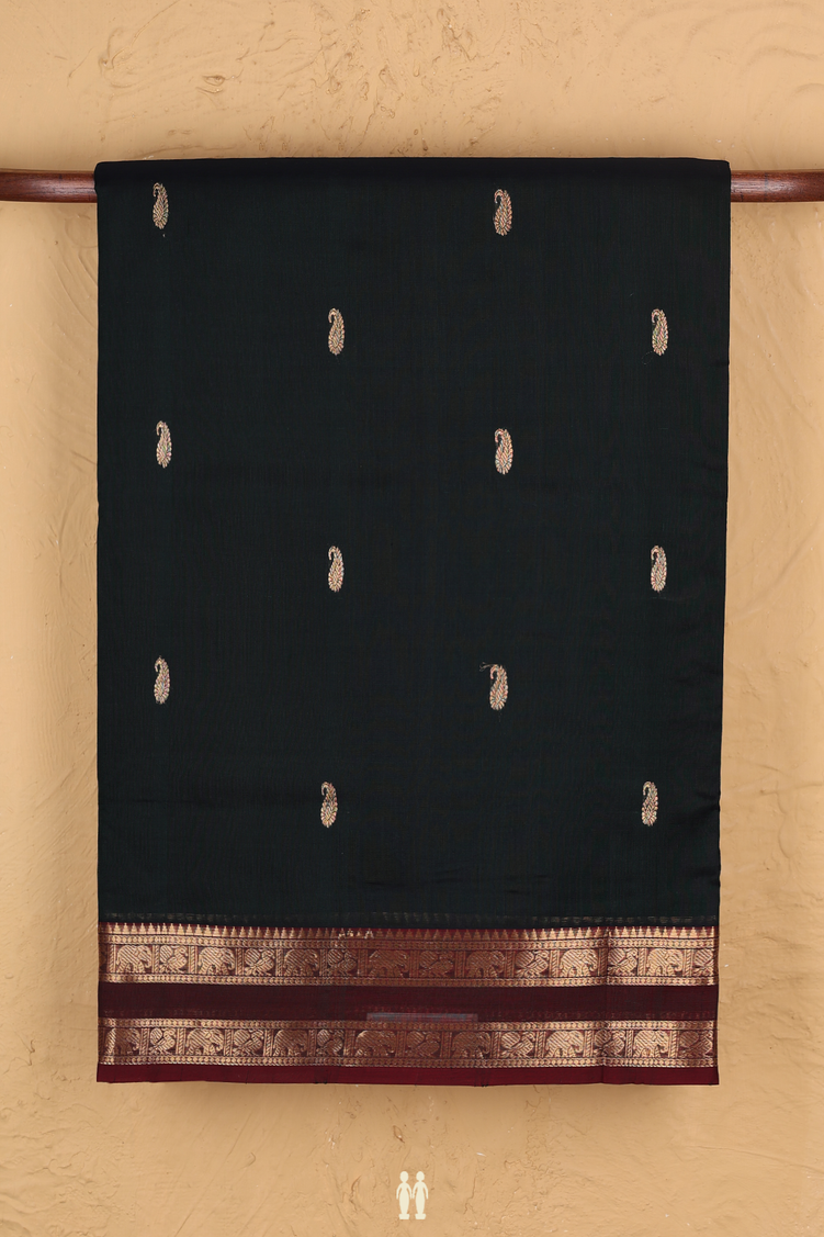 Nine Yards Silk Cotton Saree Bottle Green With Paisley Buttas