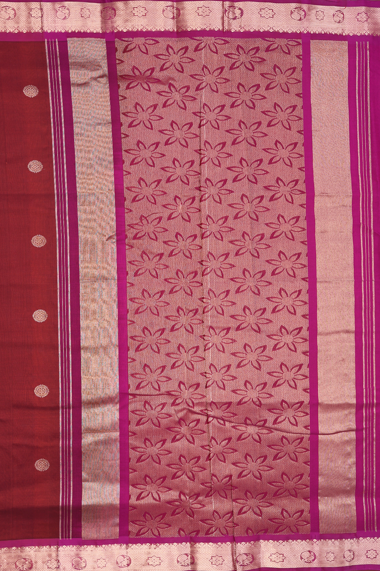 Elevate your elegance with this nine yards silk cotton saree in a rich brown shade, beautifully adorned with intricate chakram buttas. The blend of silk and cotton ensures a luxurious feel while maintaining breathable comfort. Perfect for festive occasions or formal gatherings, this saree combines traditional artistry with timeless sophistication for a graceful statement.