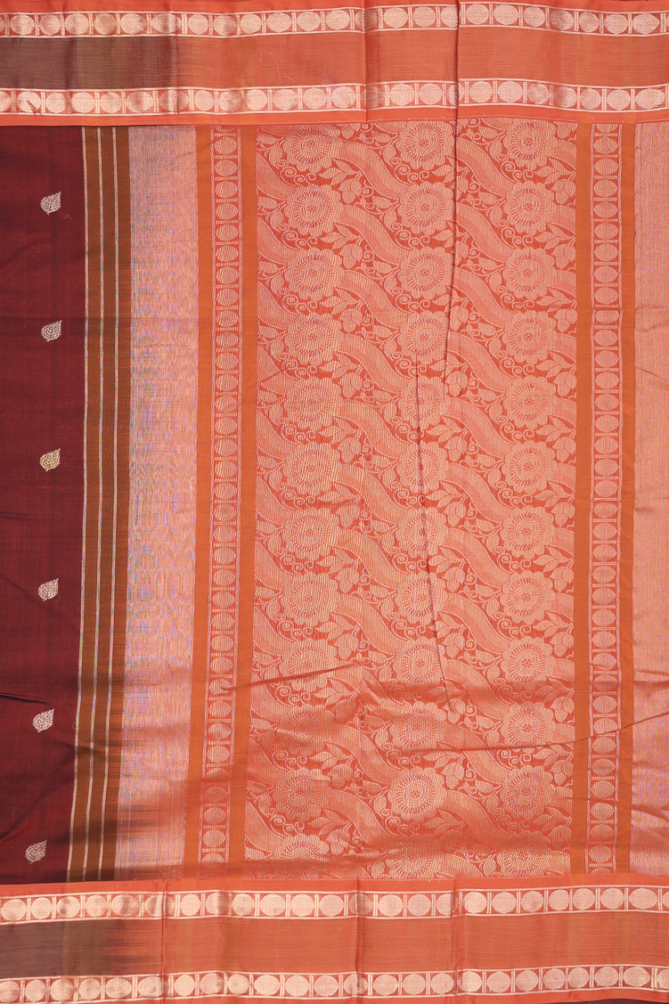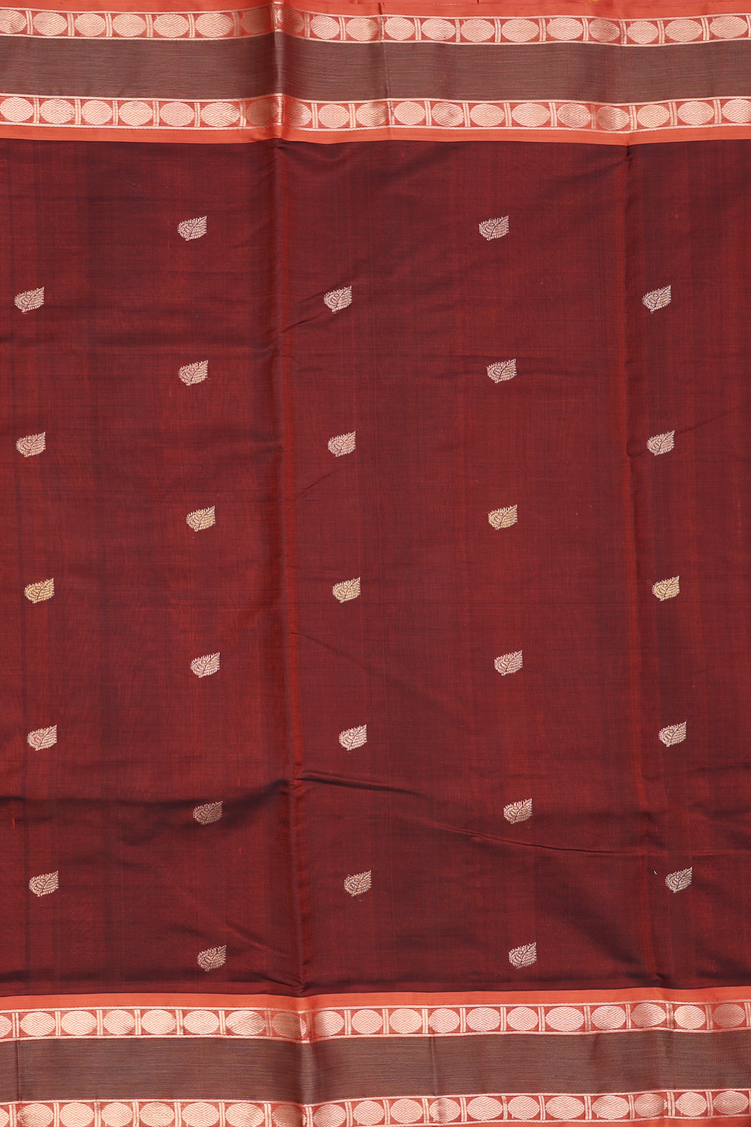 Nine Yards Silk Cotton Saree In Brown With Leaf Buttas