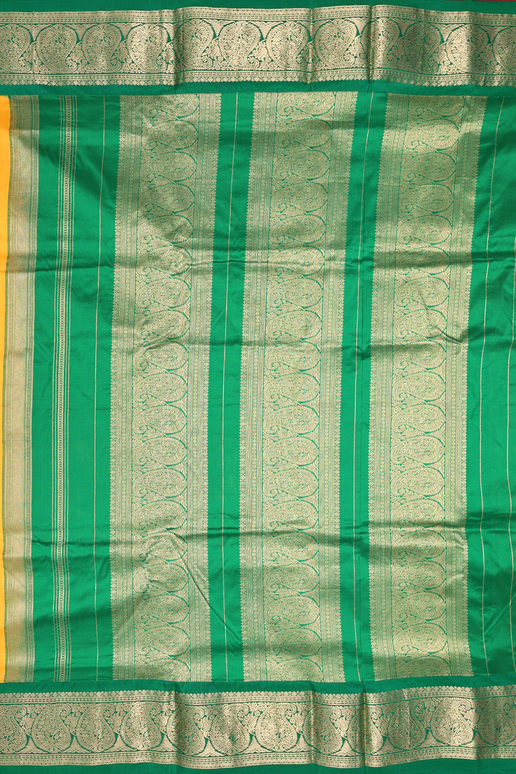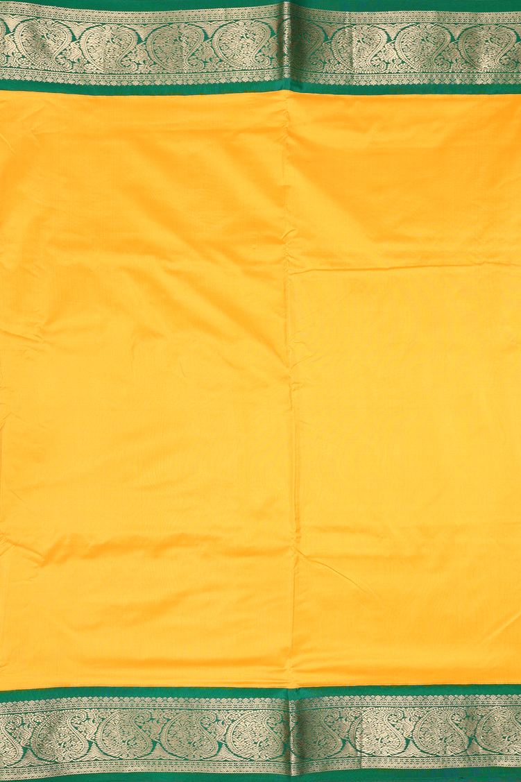 Crafted from luxurious silk, this nine yards saree features a vibrant plain yellow body elegantly complemented by a rich green contrast border. Its timeless design brings a refined charm, perfect for special occasions where grace and sophistication are desired. The smooth texture and vibrant colors promise both comfort and an exquisite statement look.