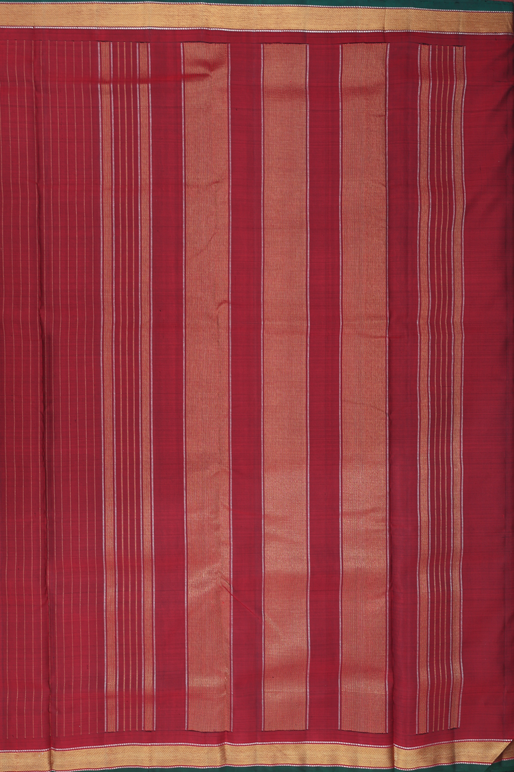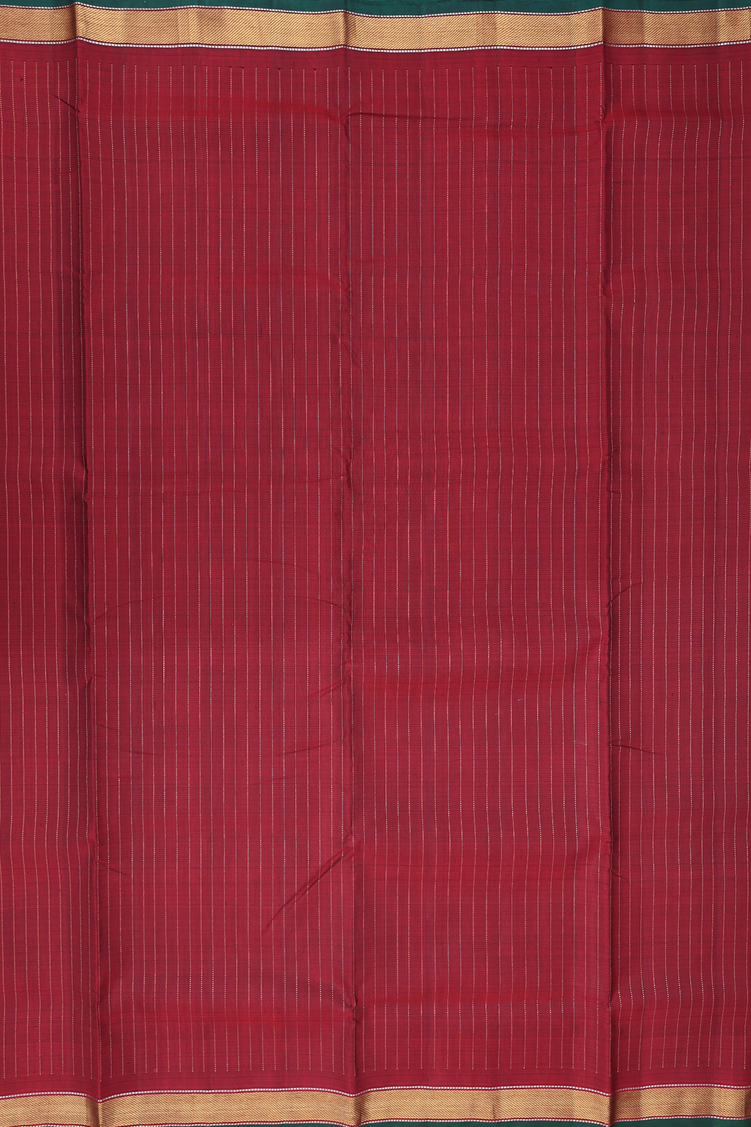 Drape yourself in timeless elegance with this exquisite nine-yard silk saree, rendered in a rich rust red hue red zari border completed by green selvedge. The refined stripe design adds subtle texture and visual interest, creating a sophisticated silhouette that flatters every frame. Crafted from premium silk, this saree offers a luxurious feel against the skin while maintaining graceful drape and movement. Perfect for weddings, festivals, and formal occasions, this versatile piece seamlessly transitions from traditional celebrations to contemporary gatherings.Â