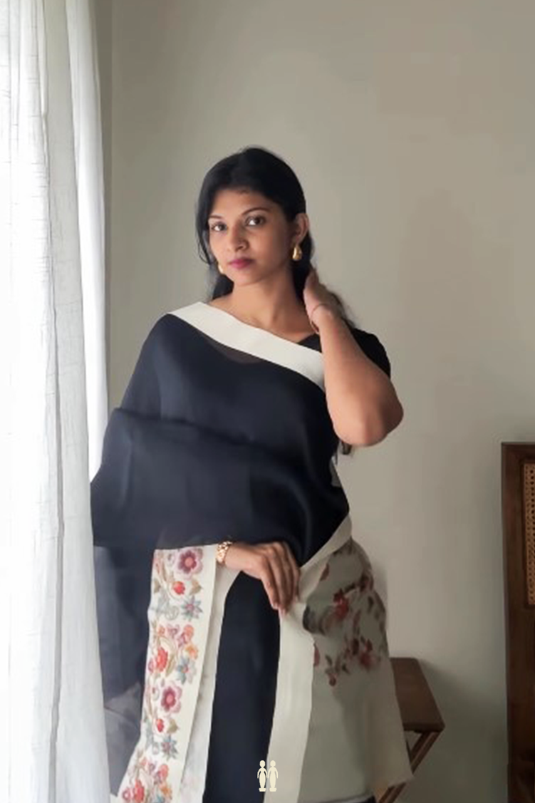 Elevate your ensemble with this exquisite black organza silk saree, gracefully enhanced by a delicate floral border. Its sheer texture offers an elegant drape, while the intricate floral accents add a refined charm. Perfect for special occasions, this saree combines timeless sophistication with subtle artistry to ensure you stand out with understated elegance.