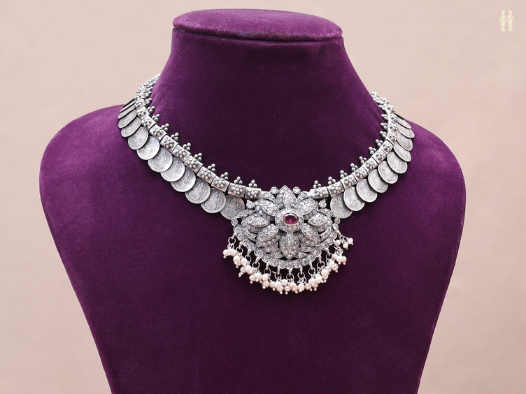 Lakshmi Kasu Malai Oxidized Pure Silver Necklace
