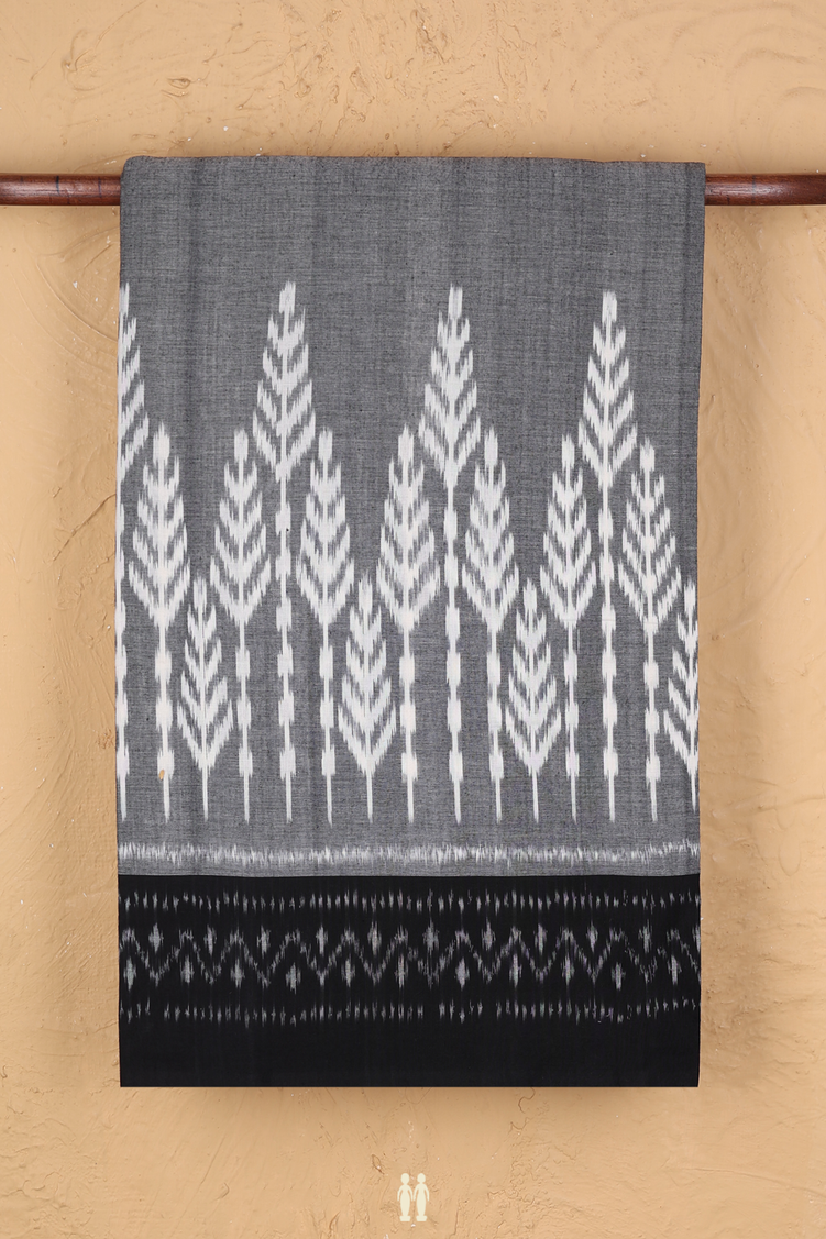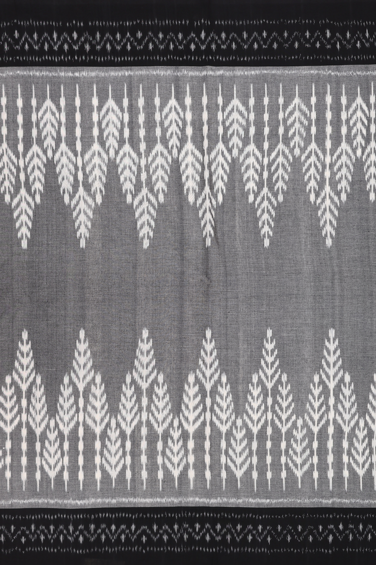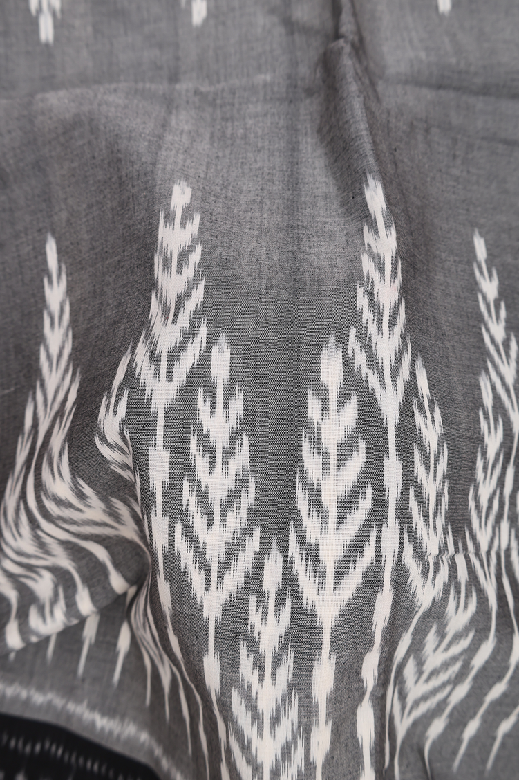 Handwoven Pochampally cotton saree featuring an elegant grey base with intricate tree motifs throughout the body. The pallu showcases a striking ikat design, adding traditional charm and visual interest. Crafted using authentic weaving techniques, this saree combines comfort with timeless style, making it perfect for casual wear and festive occasions. The natural cotton fabric ensures breathability and ease of draping, while the detailed patterns reflect the rich heritage of Pochampally weaving.