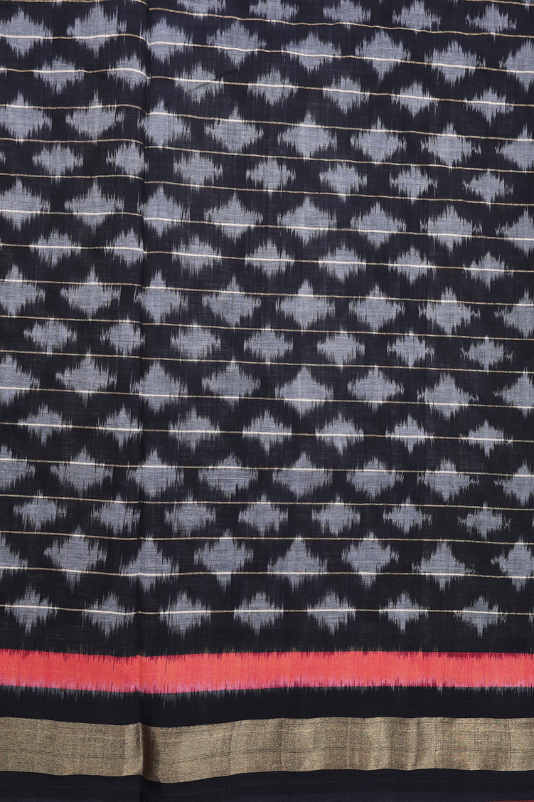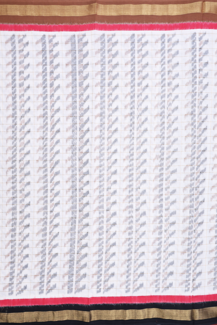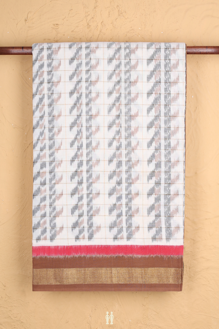 Experience elegance with this pochampally cotton saree in pristine white, featuring a subtle stripes design with ganga jamuna border. Crafted from breathable cotton, it ensures comfort while exuding timeless charm. Perfect for sophisticated occasions, this saree pairs traditional artistry with understated style, making it a versatile addition to your wardrobe.