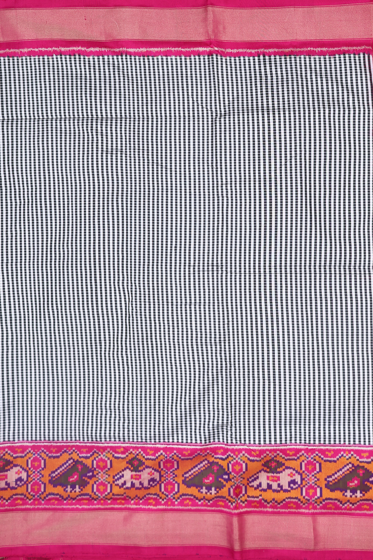 Embrace timeless elegance with this pochampally silk saree featuring a classic black and white checks design. Crafted with exquisite silk, it offers a graceful drape and subtle sheen that adds sophistication to any occasion. The distinct pattern beautifully balances tradition with a contemporary edge, making it a versatile addition to your wardrobe. Perfect for formal events or festive celebrations, this saree effortlessly elevates your style with understated charm.