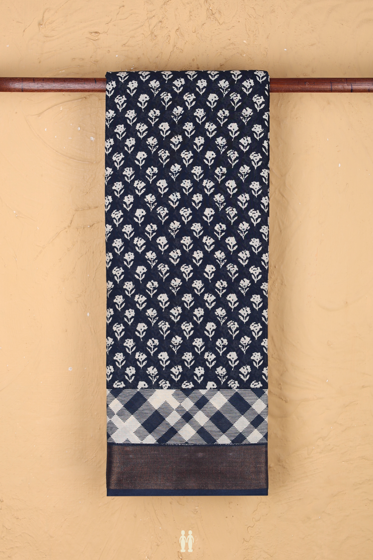 Printed Cotton Saree In Prussian Blue With Floral Design