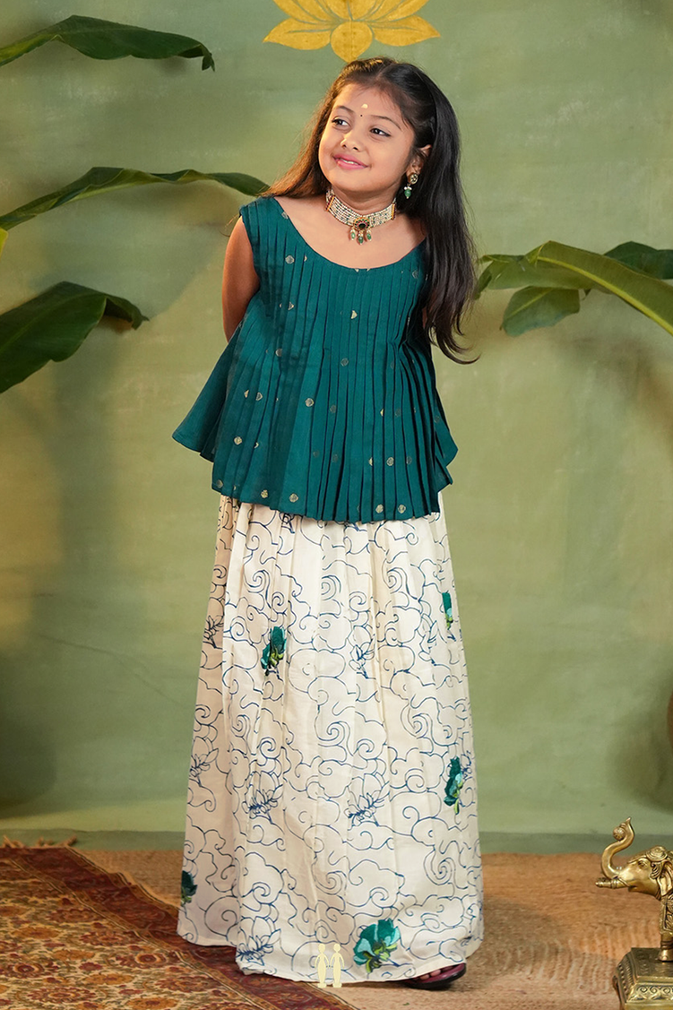 Elevate onam collection with this white printed cotton pavadai and green sattai with zari buttas, designed for comfort and style. Crafted from breathable kasavu and raw silk, it offers a lightweight, soft feel perfect for daily wear or special occasions. The intricate print adds a refined touch, making it an ideal choice for celebrations while ensuring ease of movement and lasting comfort.