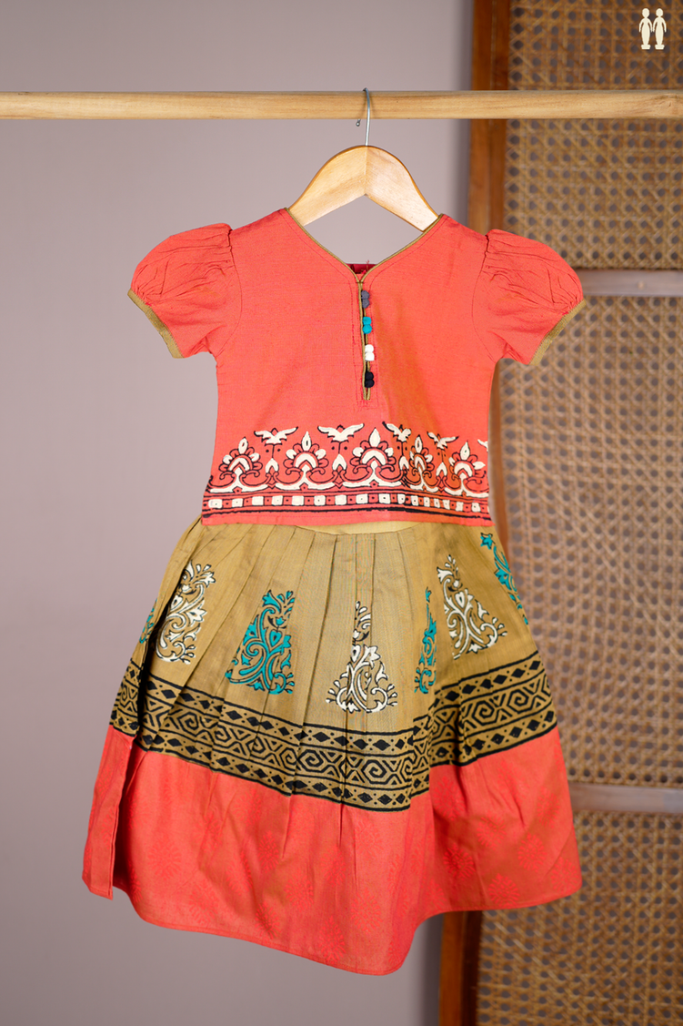 Printed Design Orange And Green Readymade Pavadai Sattai