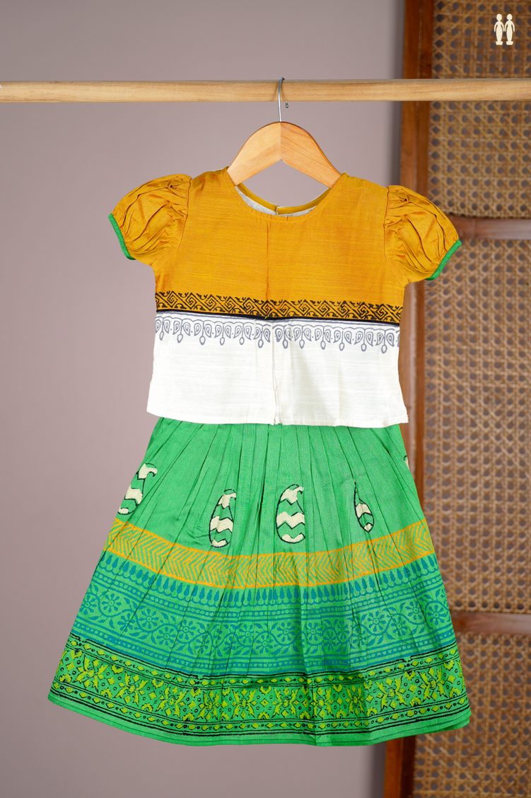 Elevate traditional style with this printed white and green readymade Pavadai Sattai. Crafted for comfort and ease, its vibrant design adds a graceful touch to any occasion. Perfectly tailored, this ensemble blends classic charm with modern convenience, making it an elegant choice for festive events and celebrations.