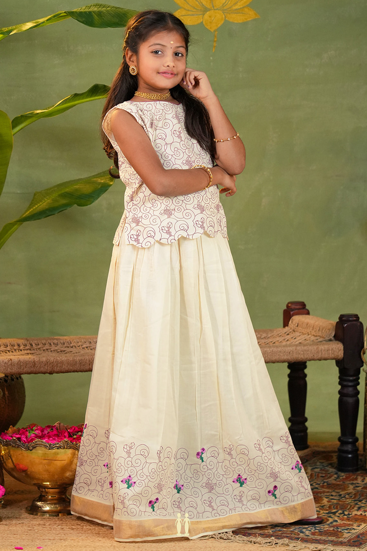 Printed Design White Kasavu Readymade Pavadai Sattai