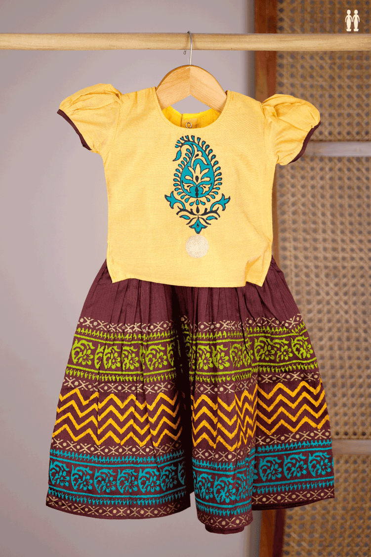 Printed Design Yellow And Brown Readymade Pavadai Sattai