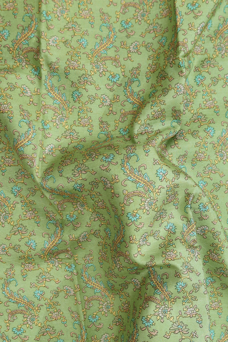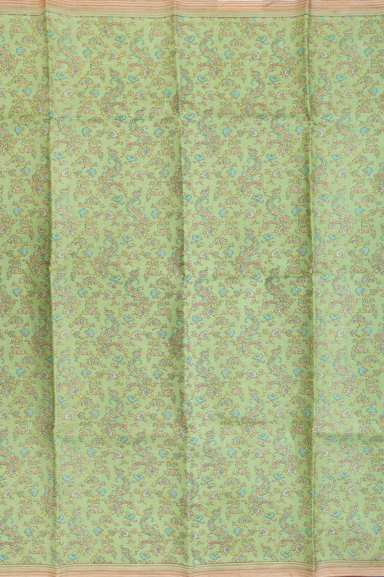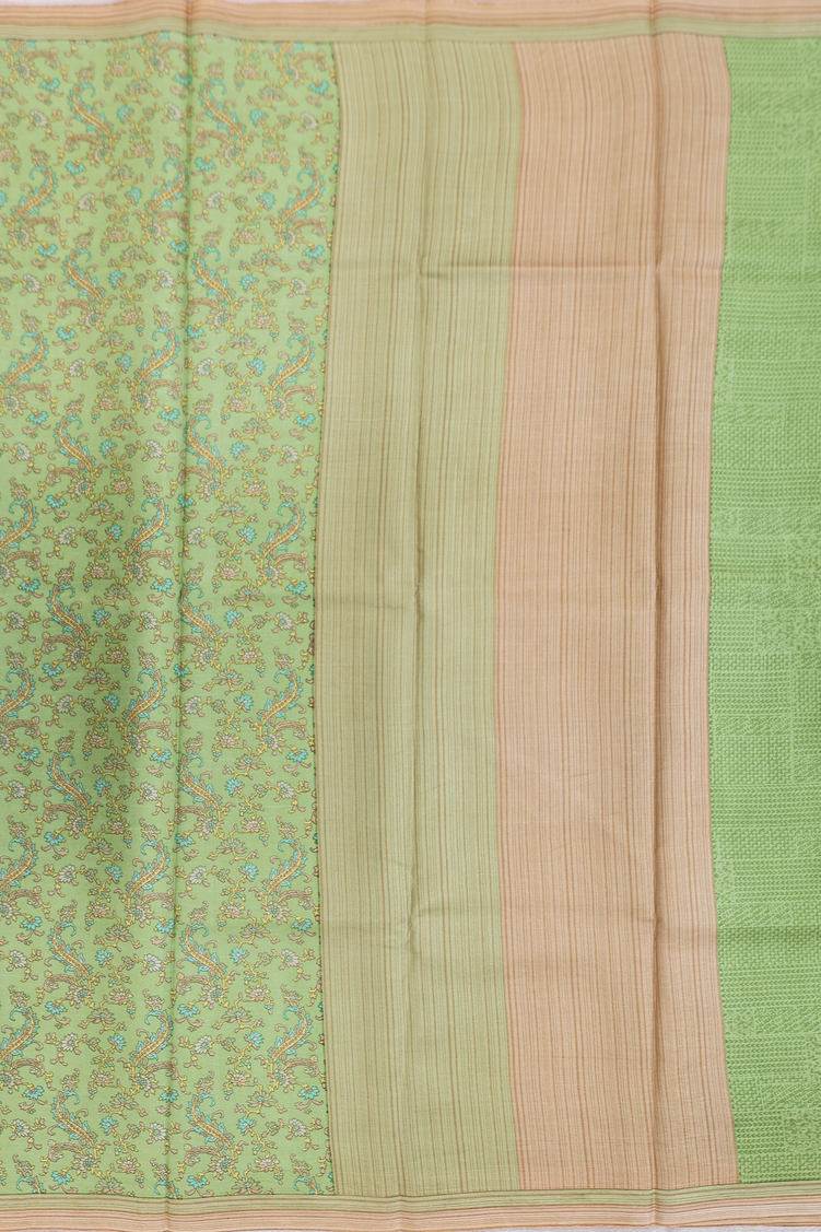 Elevate your ethnic wardrobe with this exquisite printed silk saree in a serene cardamom green hue. The saree features an intricate floral design that seamlessly blends traditional craftsmanship with contemporary aesthetics. Crafted from premium silk, it drapes beautifully while offering a luxurious feel against the skin. The sophisticated color palette makes it versatile for both festive occasions and refined everyday wear. Perfect for those who appreciate timeless elegance and fine textile artistry, this saree is a testament to refined taste and cultural grace.