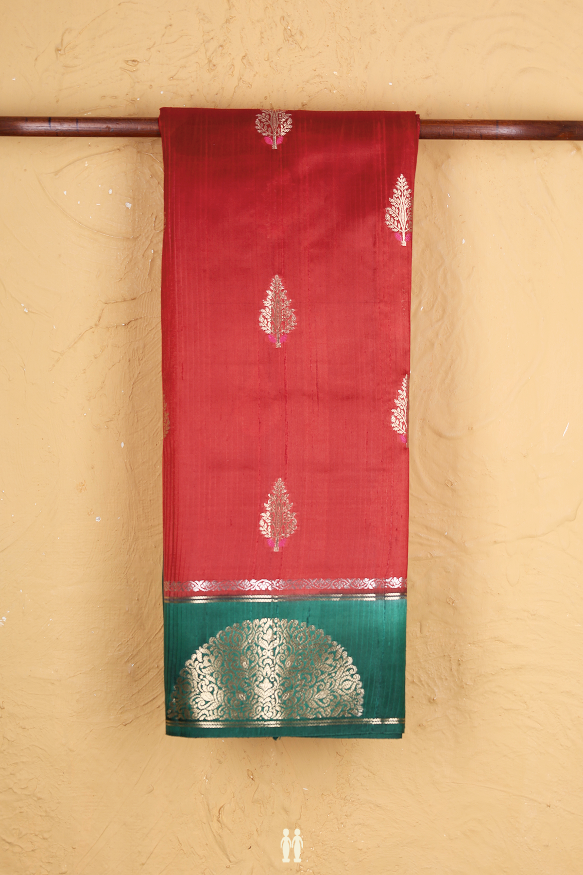 Raw Silk Saree In Crimson Red With Floral Buttas