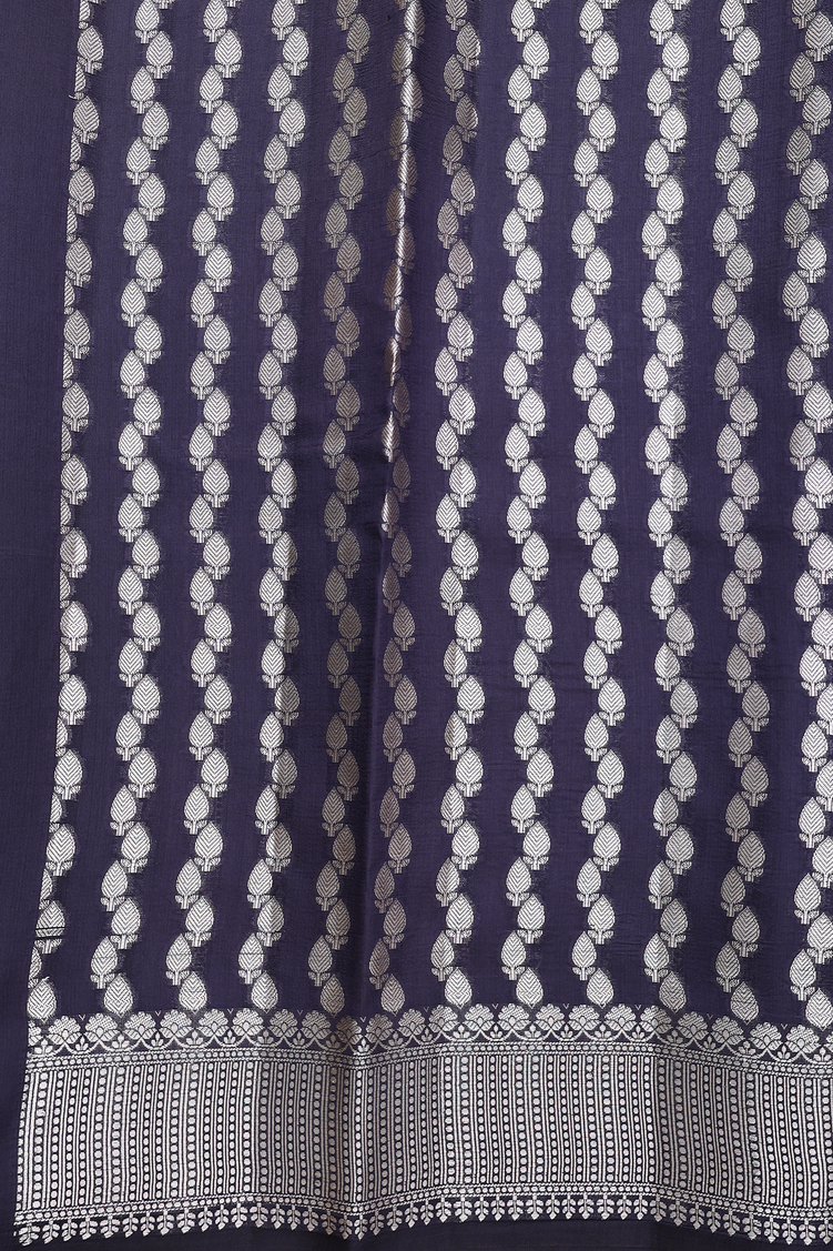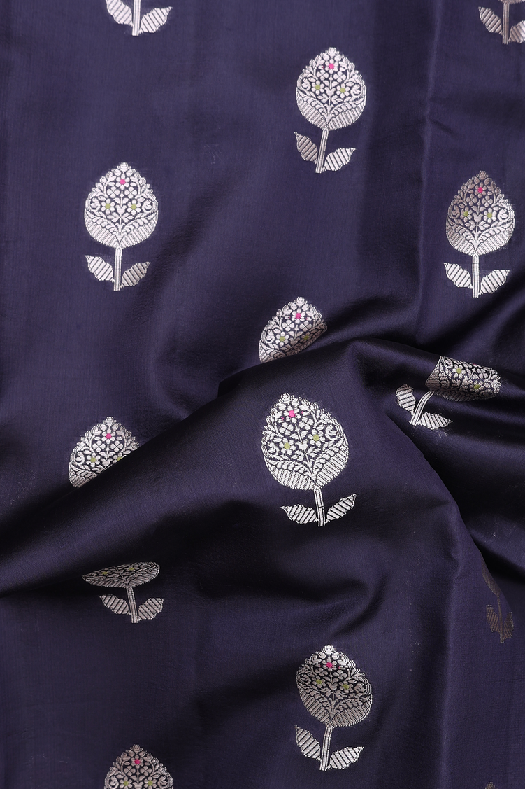 Raw Silk Saree In Navy Blue With Floral Motifs