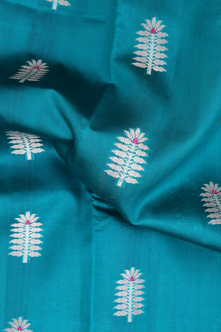 Elevate your elegance with this raw silk saree in a rich peacock green shade, adorned with delicate floral motifs. The lustrous silk fabric ensures a graceful drape, while the intricate design adds a touch of refined charm, perfect for special occasions and celebrations.