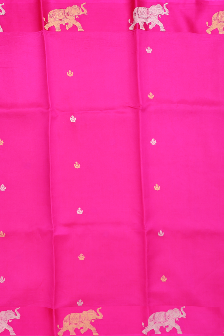 Raw Silk Saree In Rani Pink With Floral Buttas
