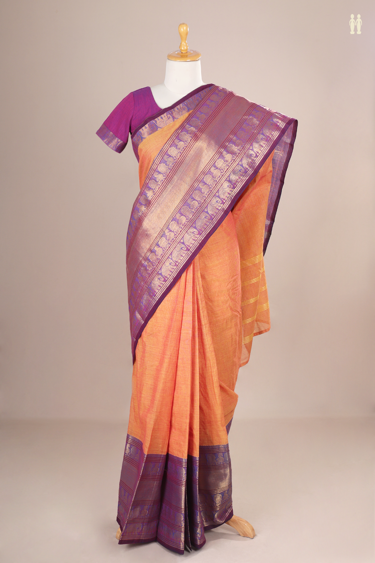 Introducing our elegant and effortless readymade cotton saree, available in a stunning shade of orange with a contrasting zari border. Its free size zip type readymade blouse is attached for your convenience. This premium saree combines comfort and intricate detailing for a truly luxurious look.