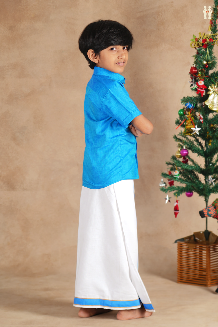 Elevate your traditional wardrobe with this refined ensemble, featuring a crisp blue cotton shirt paired with a convenient velcro dhoti. The shirt's classic regular collar offers timeless sophistication, while the premium cotton fabric ensures breathability and comfort throughout the day. The innovative velcro fastening on the dhoti provides effortless dressing without compromising on the authentic aesthetic. Perfect for cultural celebrations, religious ceremonies, or everyday traditional wear, this coordinated set combines heritage elegance with modern practicality.