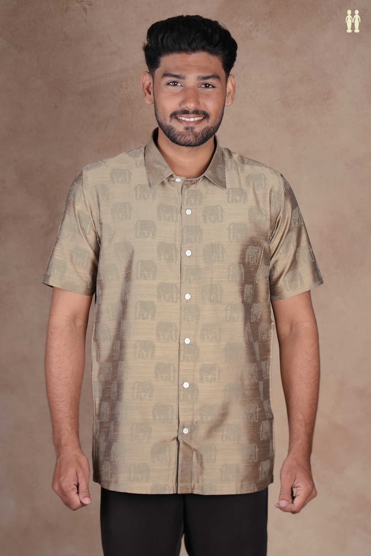 Regular Collar Elephant Design Dusty Olive Raw Silk Shirt