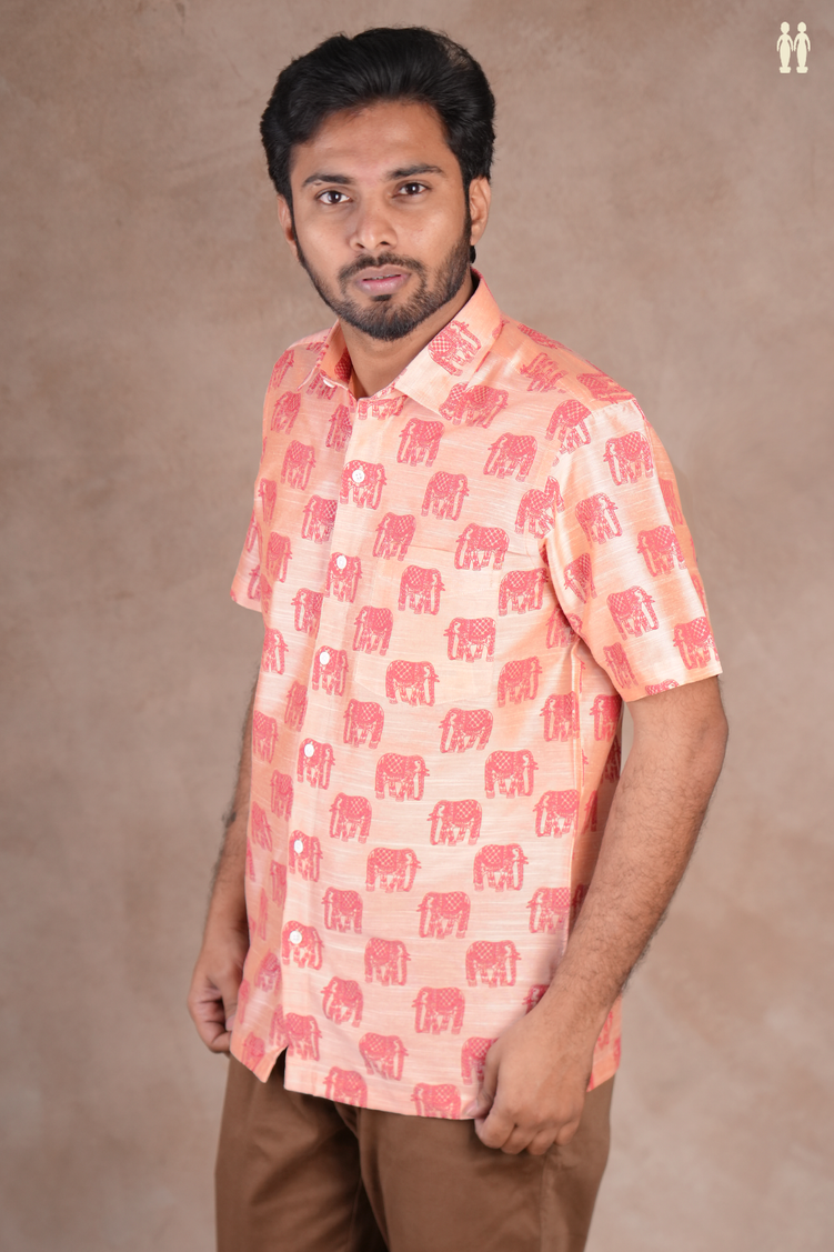 Regular Collar Elephant Design Pinkish Peach Raw Silk Shirt