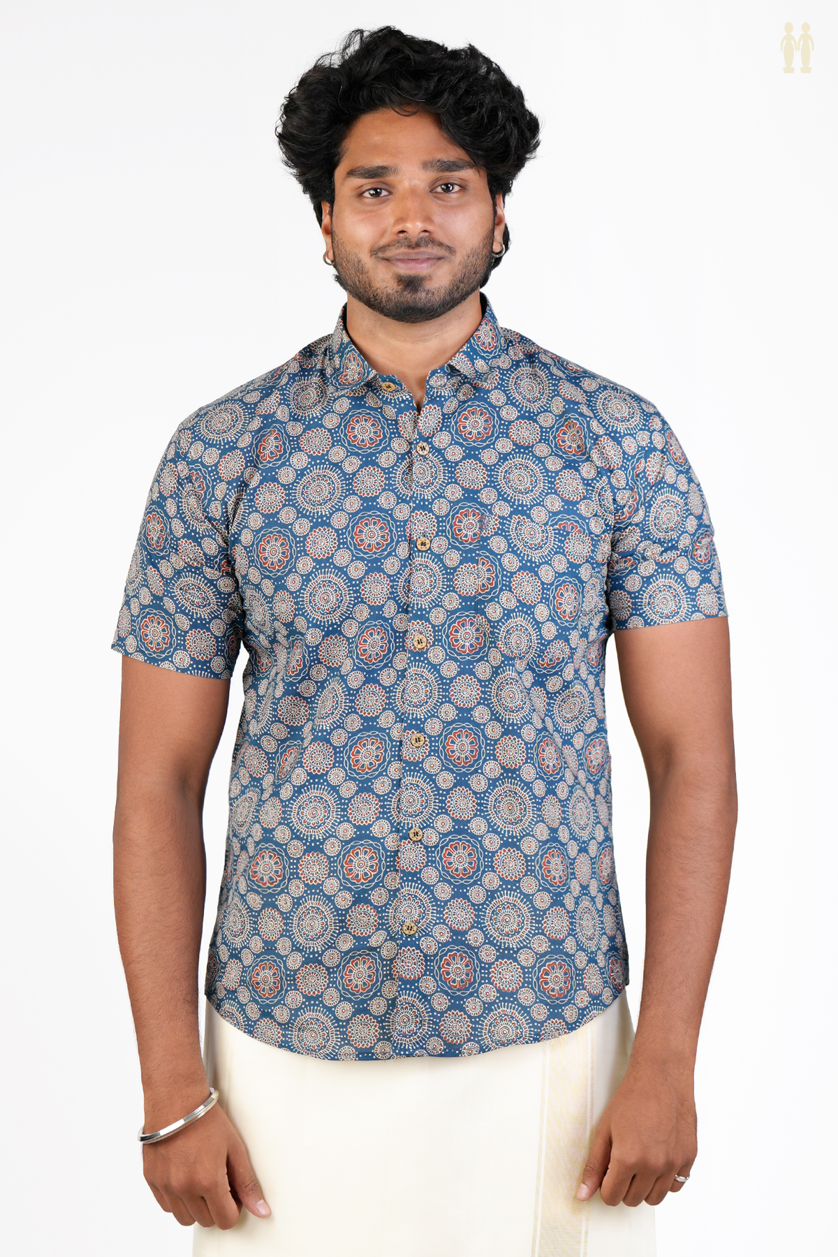 Elevate your wardrobe with this regular collar printed design blue cotton Shirt. Crafted from soft, breathable cotton, it ensures comfort throughout the day while maintaining a polished look. The intricate printed design adds a refined touch to classic blue fabric, making it suitable for both professional settings and casual outings. Its regular collar offers a timeless silhouette that pairs effortlessly with smart trousers or jeans for a sophisticated style statement.