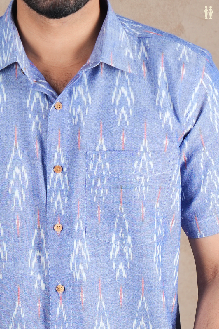 Regular Collar Printed Design Blue Ikat Cotton Shirt