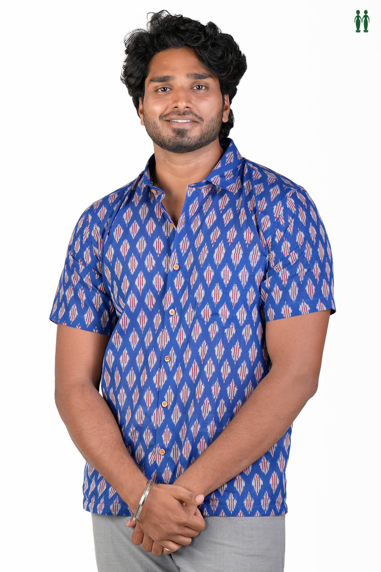 Regular Collar Printed Design Royal Blue Cotton Shirt