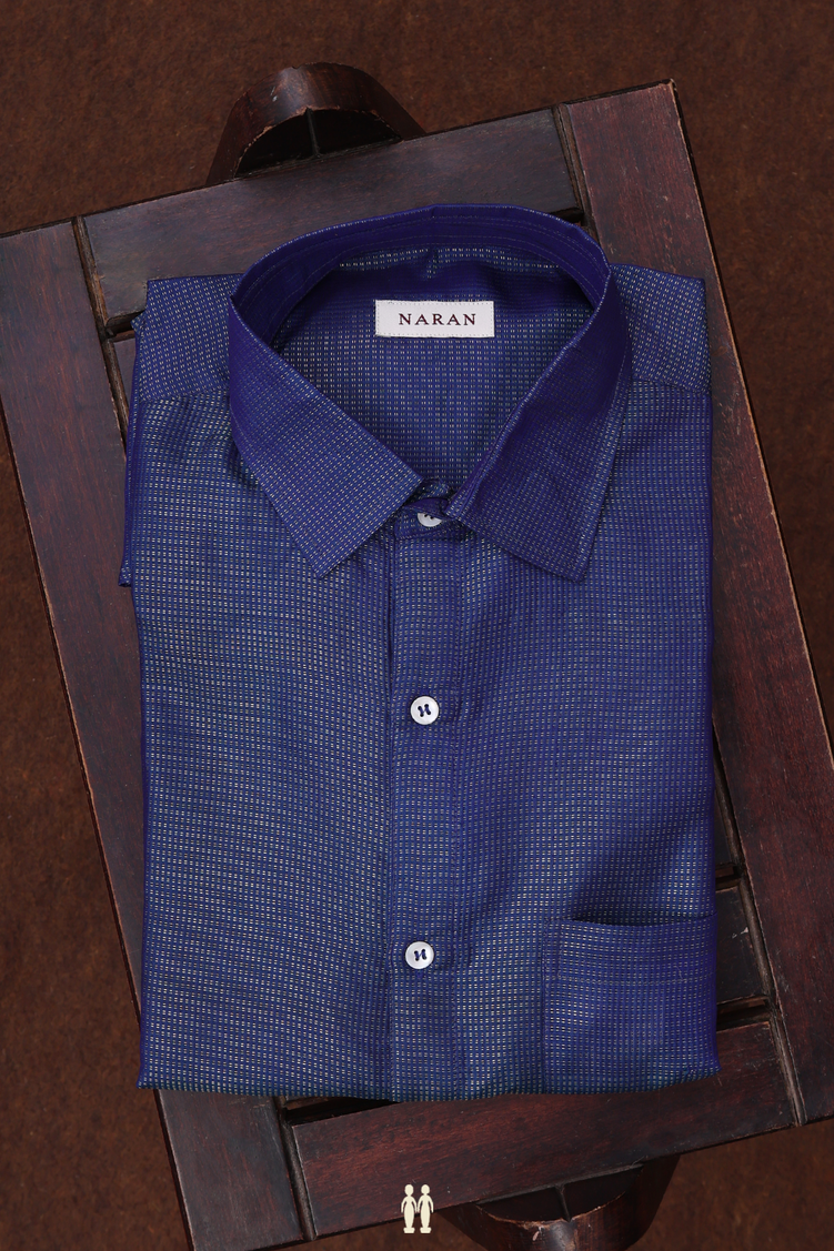 Regular Collar Stripes Design Navy Blue Silk Shirt