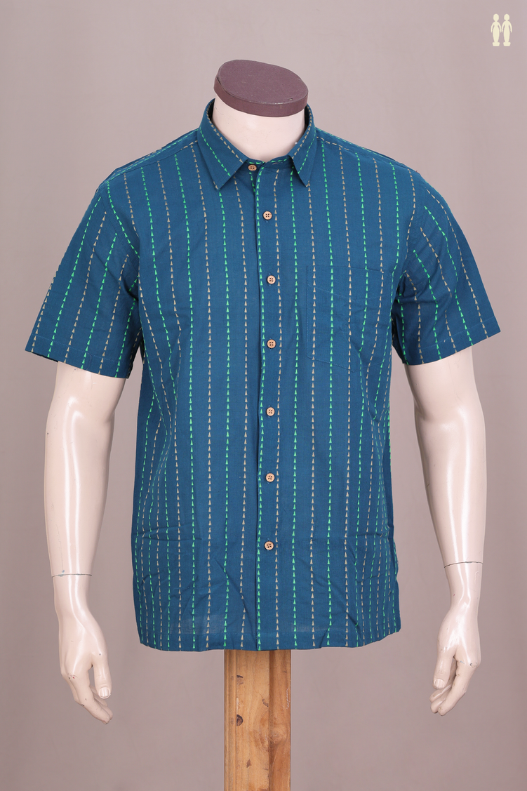 Regular Collar Stripes Design Prussian Blue Cotton Shirt