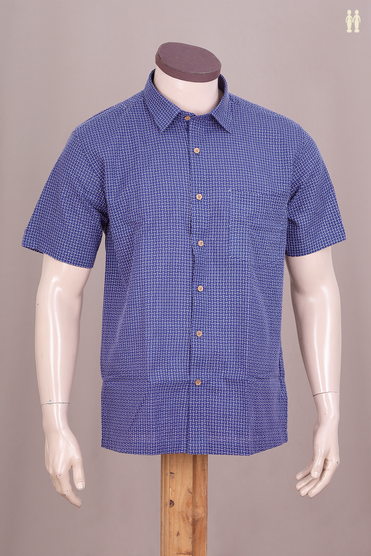 Regular Collar Threadwork Design Blue Cotton Shirt