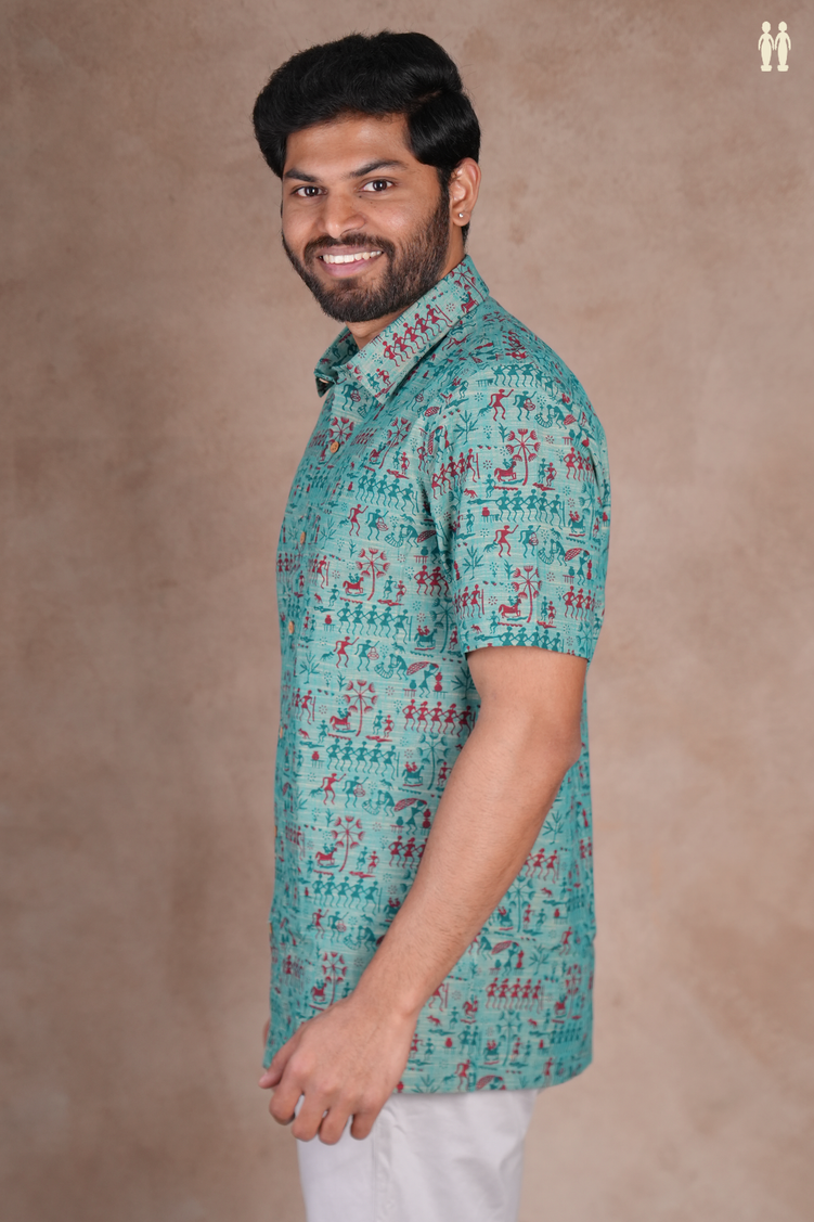 Regular Collar Warli Design Green Cotton Shirt