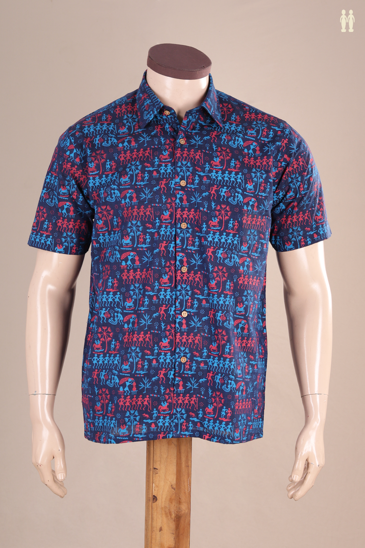 Regular Collar Warli Printed Oxford Blue Cotton Shirt