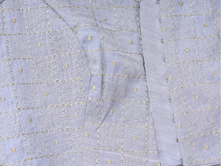 Elevate your ensemble with this sophisticated light grey raw silk blouse featuring a timeless round neck and elegant checks design. Crafted for comfort and style, this readymade blouse offers a refined silhouette that complements both traditional and contemporary outfits with subtle grace.