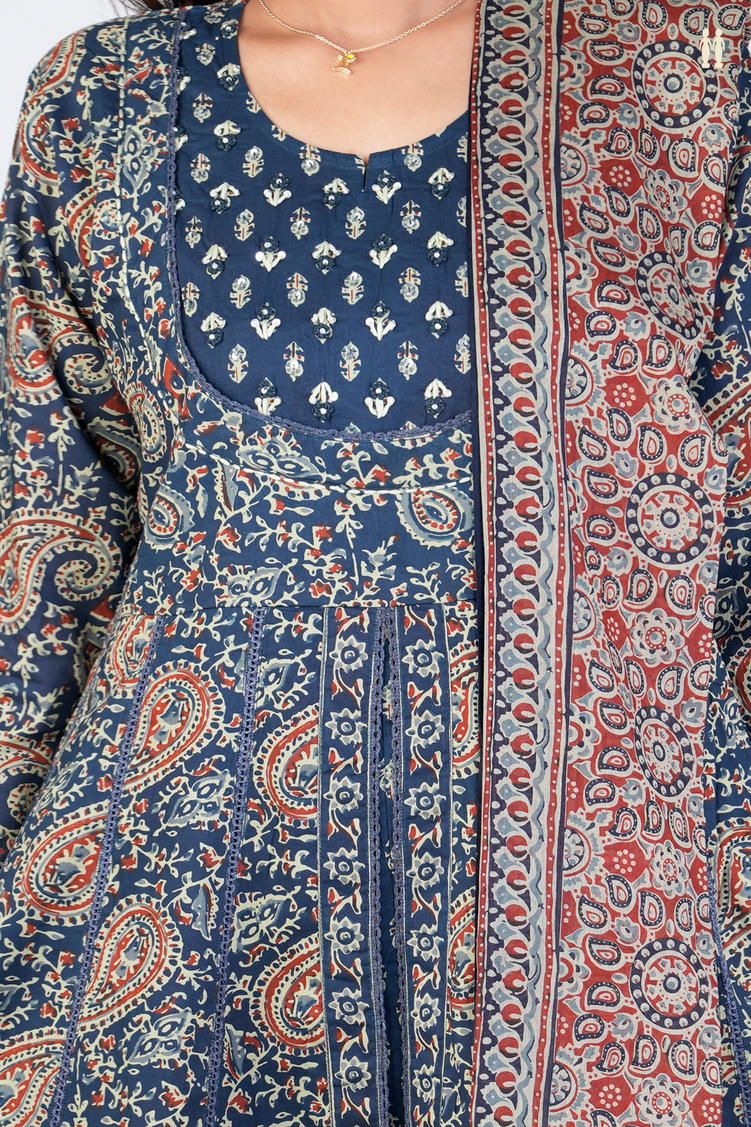 Elevate your ethnic wardrobe with this round neck floral design blue printed cotton salwar set. Crafted from breathable cotton, it offers both comfort and elegance, perfect for warm days. The intricate floral prints and refined round neckline bring a subtle grace to your look, making it an ideal choice for casual outings or festive occasions.