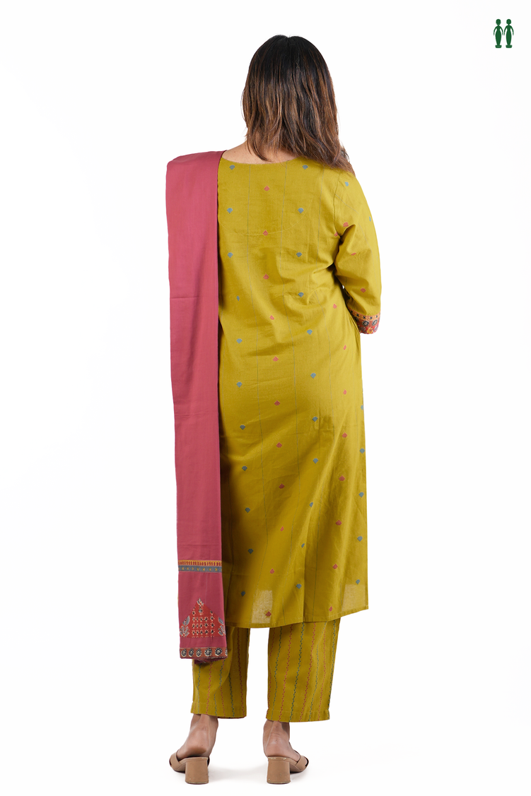 Round Neck Threadwork Buttas Olive Yellow Cotton Salwar Set