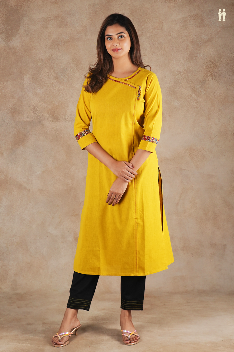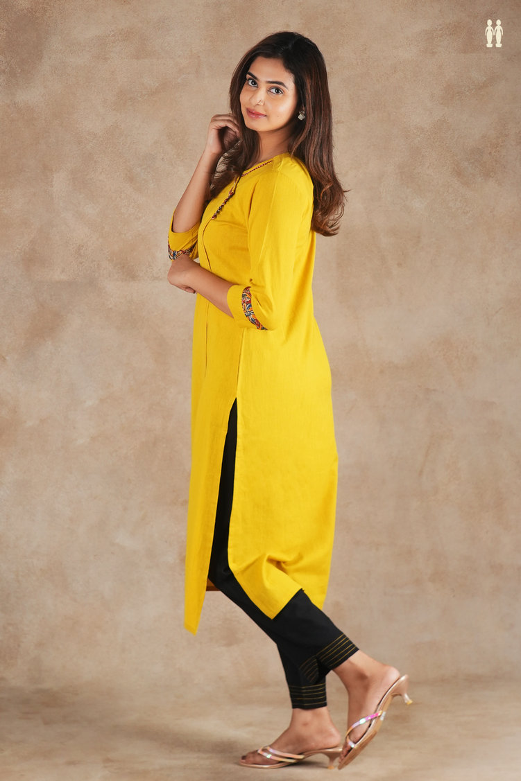 Elevate your everyday wardrobe with this timeless yellow cotton kurta, crafted for understated elegance and comfort. The round neckline and flowing silhouette create a flattering, versatile piece that transitions effortlessly from casual gatherings to relaxed office settings. Made from breathable cotton, it offers all-day wearability in India's warm climate while maintaining a refined appearance. Perfect for layering or wearing solo, this long kurta embodies classic simplicity with contemporary appeal.