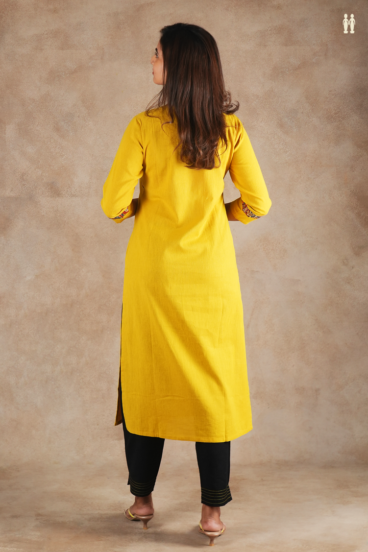 Round Neck Plain Yellow Cotton Long Kurta