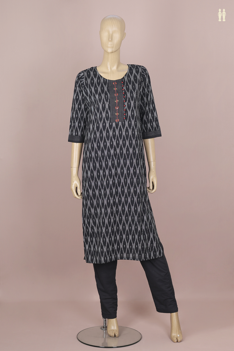 Elevate your wardrobe with this round neck printed design black cotton salwar set. Crafted from breathable cotton, it ensures comfort throughout the day while showcasing a refined printed pattern. The classic round neck adds a subtle elegance, making it perfect for both casual outings and formal occasions. Its timeless black shade effortlessly complements your style, offering a sophisticated and graceful look.